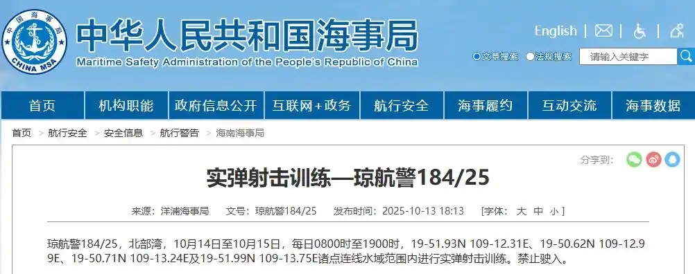 据中国海事局网站消息,洋浦海事局发布航行警告,10月14日至10月15日,每日8时至19时,北部湾部分海域进行实弹射击训练,禁止驶入。